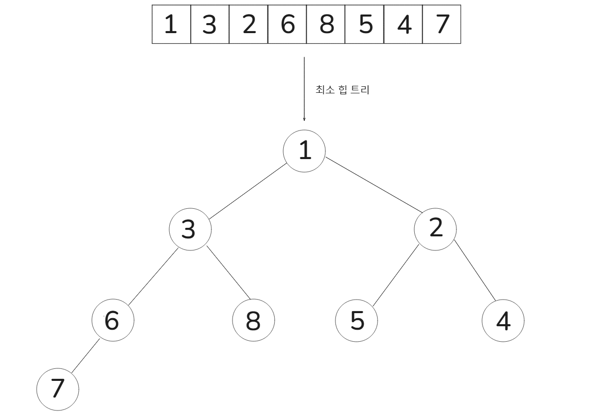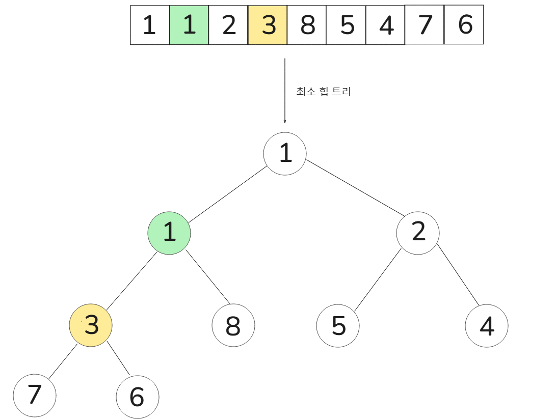 현재 힙은 최소힙 형태로 구성되어 있습니다