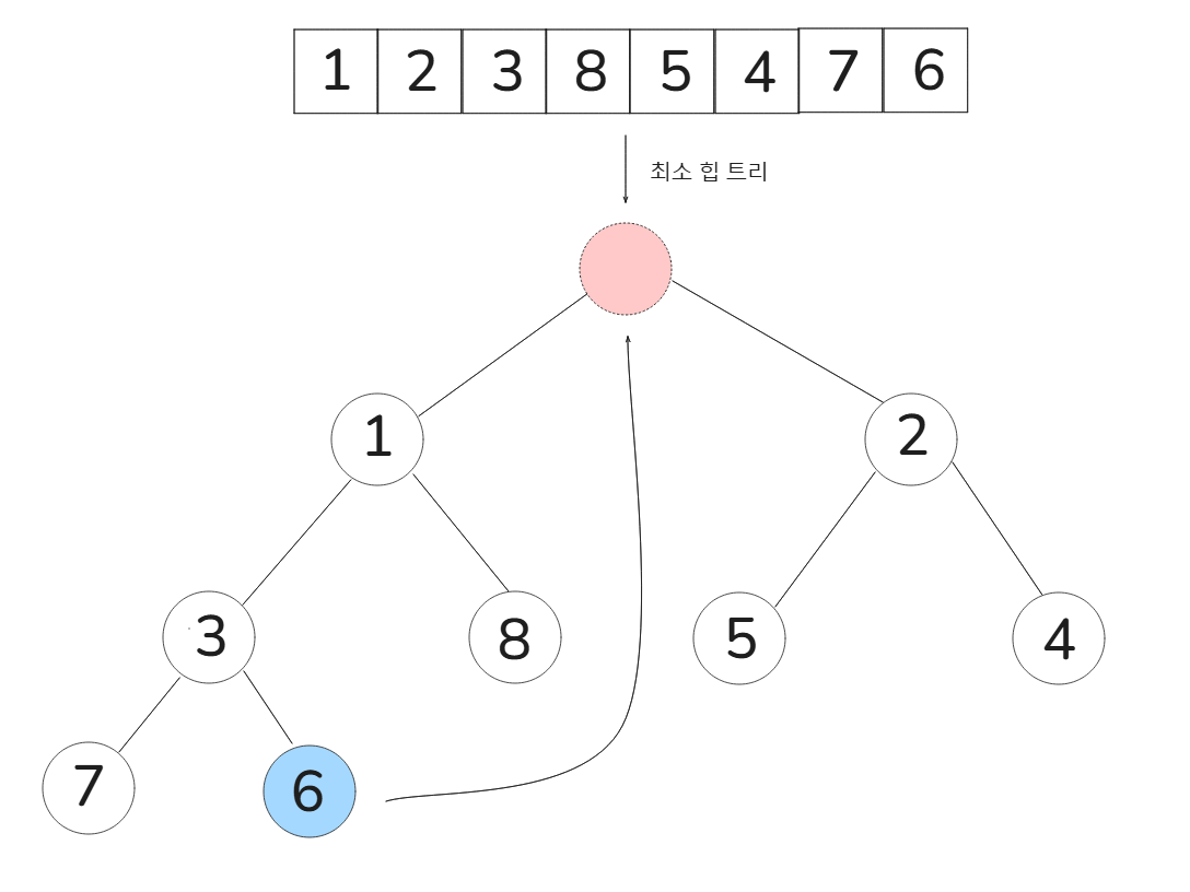 새 루트(6)은 두 자식(1, 2) 중 더 작은 값(1)과 교환합니다