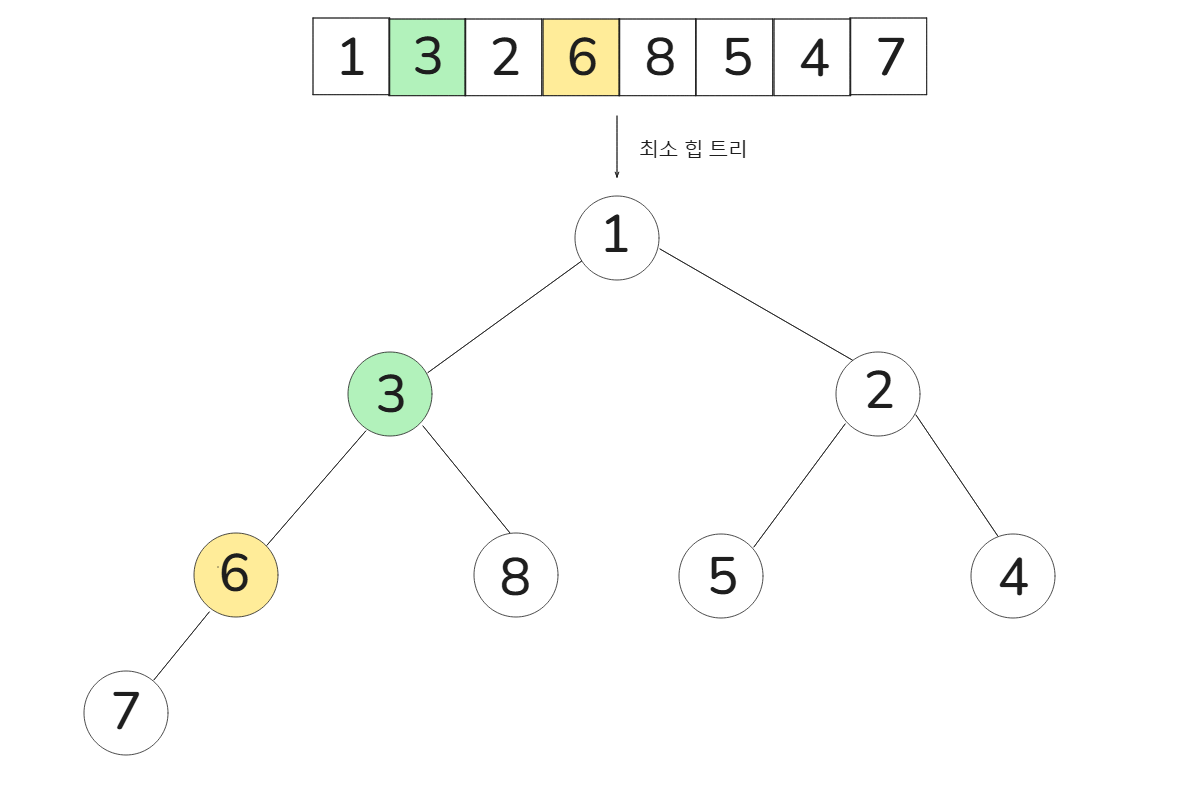(자식 인덱스)/2(부모 인덱스)*2(부모 인덱스)*2 + 1먼저 예시 배열 [7, 3, 5, 2, 8, 1, 4, 6]을 완전 이진 트리 형태로 구성합니다