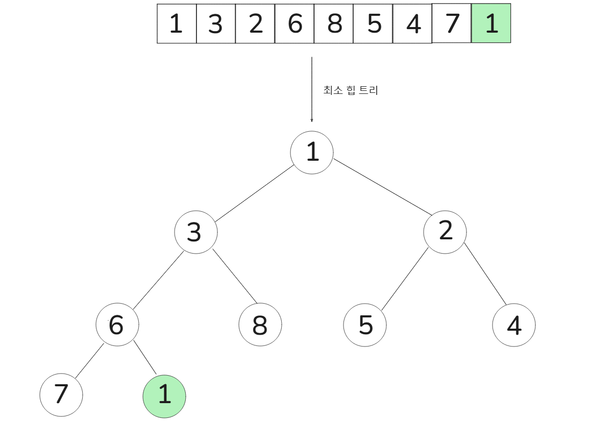 새로운 원소 1이 삽입되었지만 최소 힙 구조가 유지됩니다