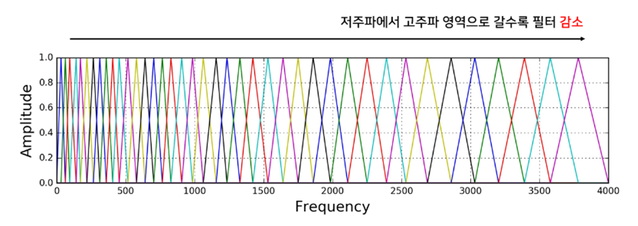 Mel Scale 변환 함수를 통해 주파수 대역을 분할한 후, 각 대역에서의 주파수 성분을 추출하는데 사용되는 삼각 필터이다.