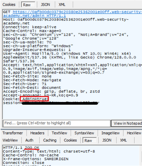 /admin에 접속하면 아래와 같이 Cookie: Admin=false;라 설정되어 있어서 admin 패널에 접근할 수 없었던 것이다.