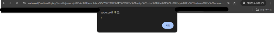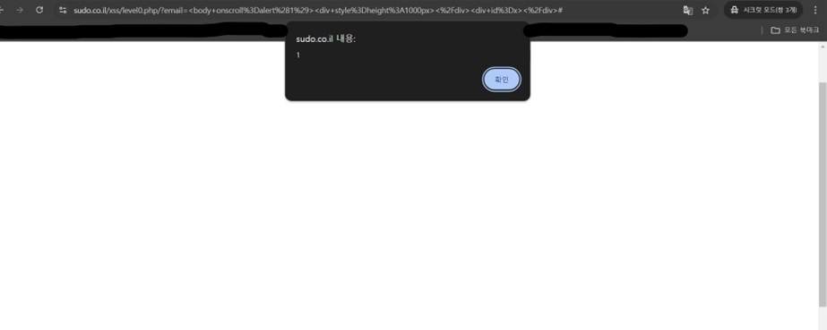 body 태그에 onscroll 이벤트 핸들러가 설정되어 있다. 사용자가 페이지를 스크롤할 때 이 이벤트가 발생하고, alert(1)이 실행된다. 결과적으로 사용자는 "1"이라는 경고 메시지를 보게 된다.