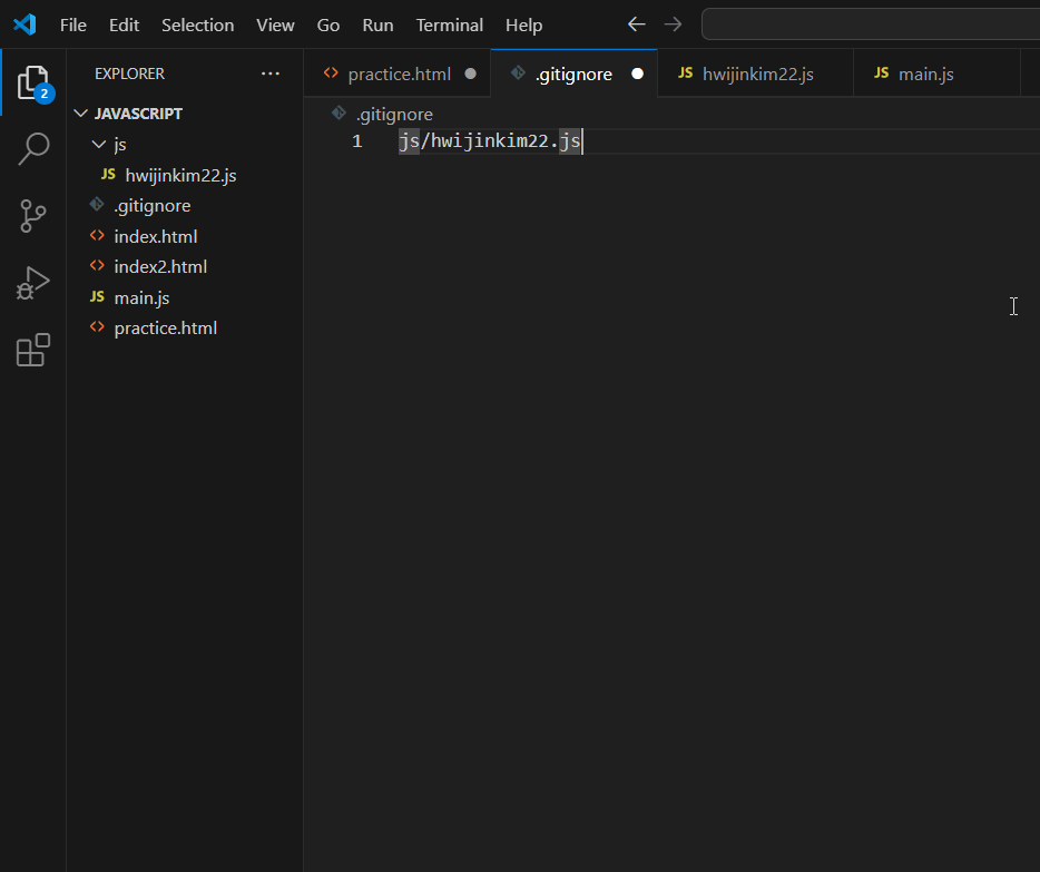 해주시면 저 .gitignore에 적은 js 폴더 안에 있는 hwijinkim22.js는 제외하고 push가 되는 겁니다.