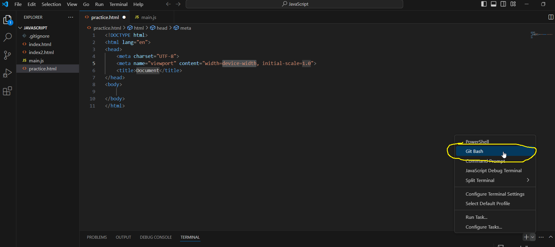 우측 하단에 + 옆 아래화살표↓ 버튼 > Git bash 눌러주시면 bash 터미널이 열립니다! (Git가 뭔지 싶은 분들은 제 게시글에 있습니다)