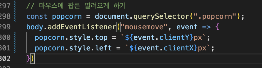 자 그러면 이렇게 css만 작성하면 끝이 나느냐? 그건 아니다. 저렇게만 하면 마우스를 따라 움직이는 팝콘을 구현하는 건