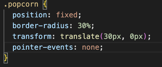 transform: translate(x, y); 를 사용해 팝콘이 마우스와 어느정도 거리를 유지할지 작성하면 되는데, x=30px, y=0px이