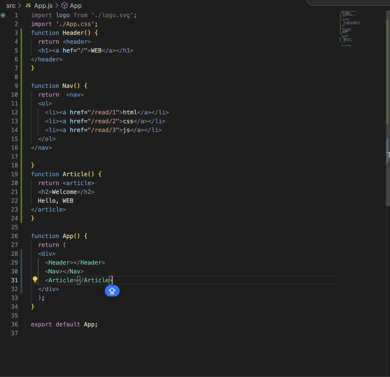 아래 App() 함수 내에 Header 함수를 집어넣어주면 끝!