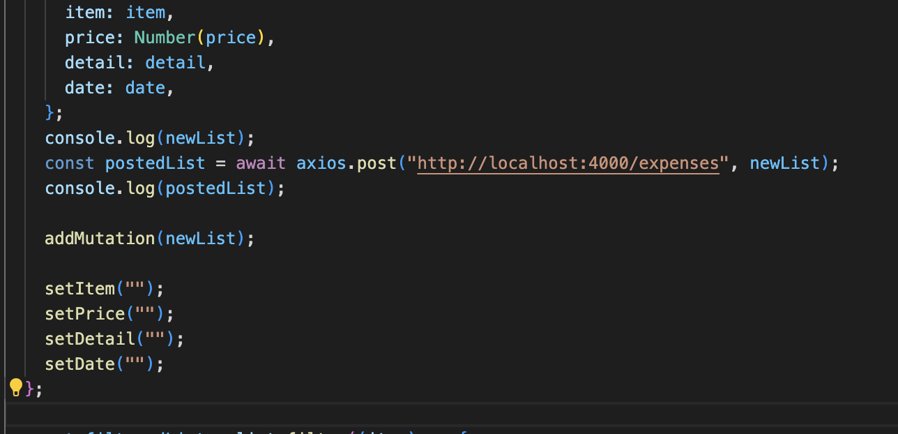 AuthContext.jsx에서 useMutation()을 사용해 mutatinFn에는 위에 만들어둔 addExpenses 함수를 넣어주고 onSuccess를 사용해 성공시 invalidateQueries를 사용해 데이터를 최신 데이터로 업데이트 시켜줌