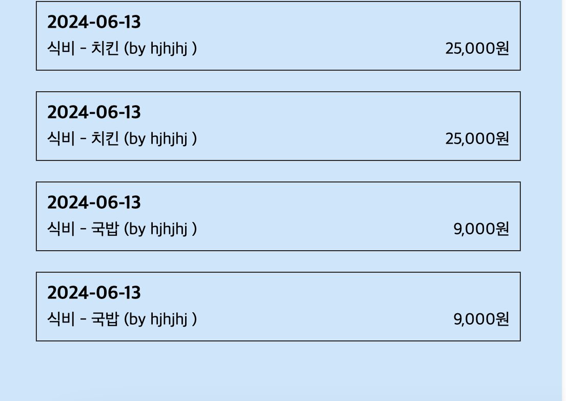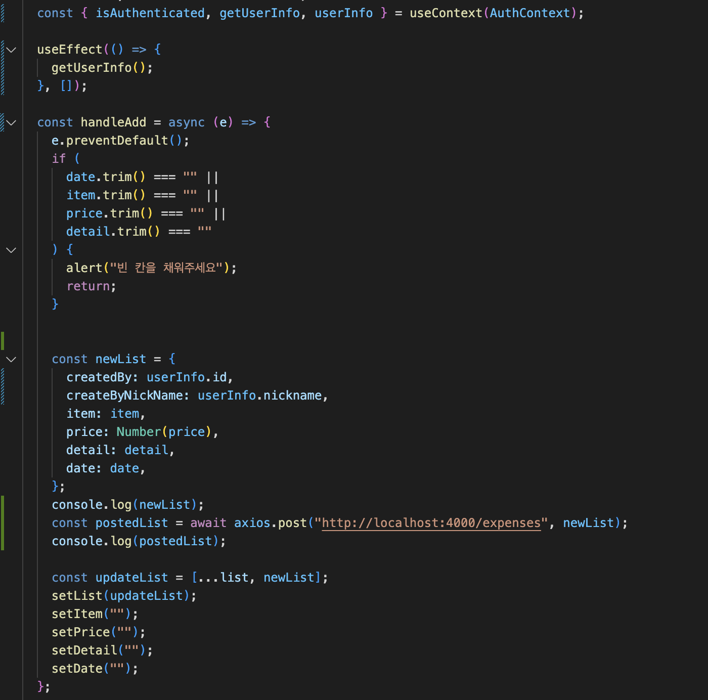 기존의 내용에서 useContext로 getUserInfo, userInfo를 받아온 다음에 handleAdd 함수 내에서 기존의 4가지 항목 뿐만이 아니라 createBy, createByNickName을 추가함으로써 어떤 유저가 지출을 작성한 것인지도 알 수 있게끔 로직을 구성하였다.