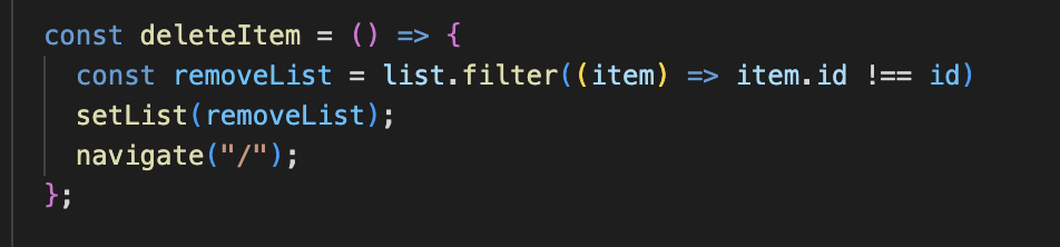 전에 삭제 기능을 만들었을 때 item.id가 id와 같지 않은 경우에만 해당 item을 removeList에 포함시키는 새로운 배열을 생성하는 로직을 보고 느낀 게 아! 매개변수로 newList를 받을 게 아니라 id를 받아야 하는 구나