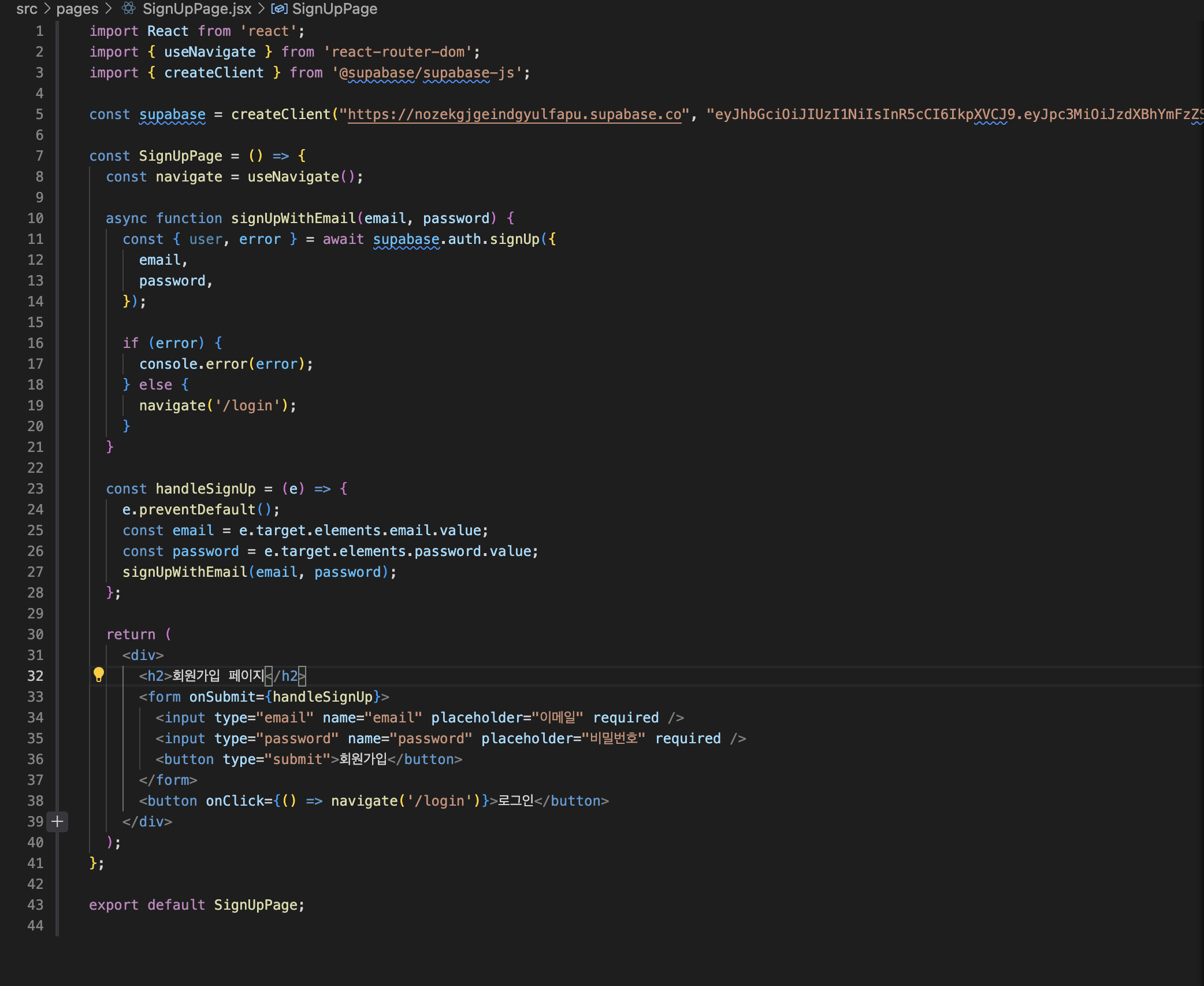 여기까진 사실 내가 따로 뭔가 한 건 없고 supabase 가이드 에서 보여준 코드 그대로 supabase 기본 셋업을 맡으신 분이 컴포넌트만 나눠놓은 건데.. supabase를 써본 적이 없어서 이 이후로는 뭘 건드려야 할지 감을 못 잡겠다.