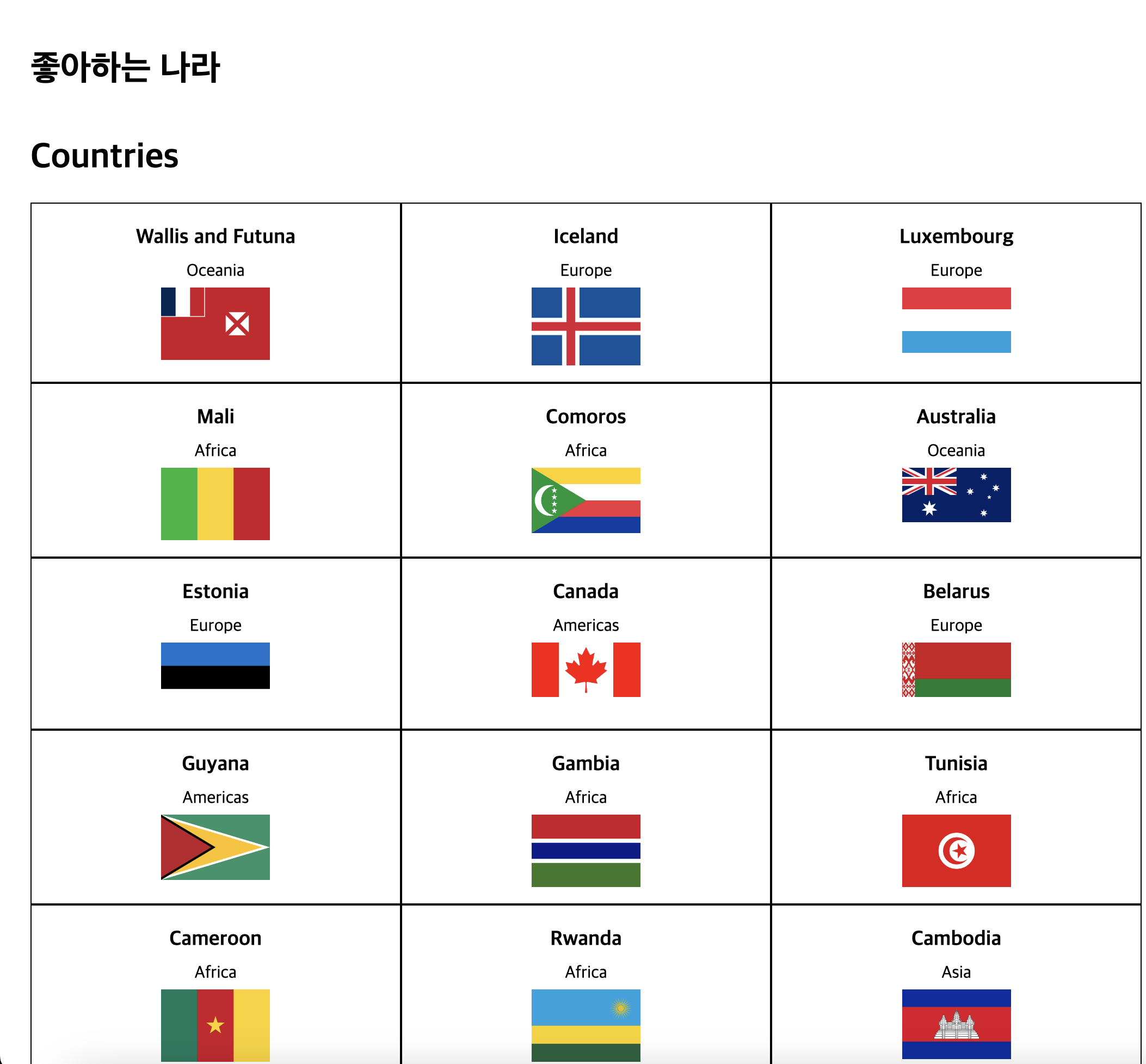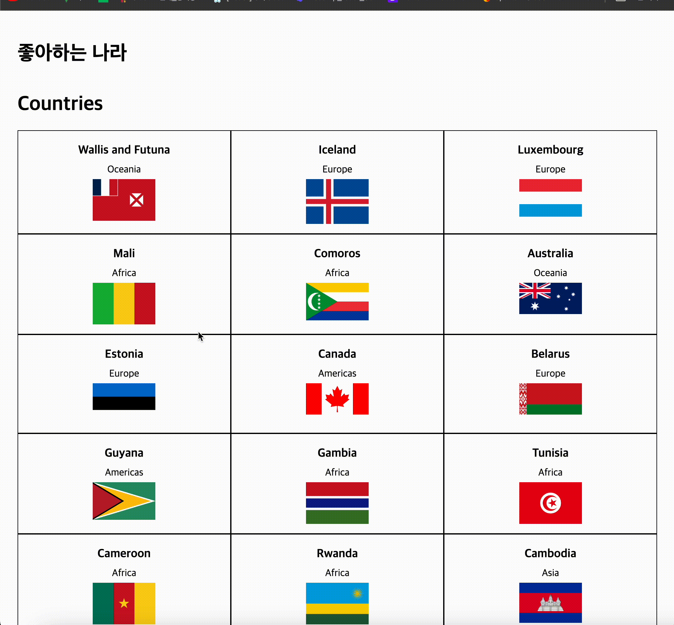 ๋์ผํ ๋๋ผ๊ฐ selectedCountries์ ์๋์ง ํ์ธํ๊ณ , ํด๋น ๋๋ผ๊ฐ ์์ผ๋ฉด ์ ๊ฑฐํ๊ณ ์์ผ๋ฉด ์ถ๊ฐํ๋ ๋ฐฉ๋ฒ์ผ๋ก ์ฝ๋๋ฅผ ์์ฑํ์