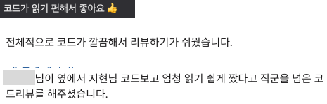 칭찬 중에서는 다른 내용보다도 깔끔한 코드에 대한 내용이 많은 것을 보며 나도 모르게 그 부분에 집착하고 있었구나 느꼈다.