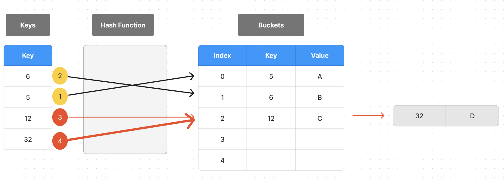 → 두 개 이상의 키가 동일한 인덱스에 매핑되어 해시 충돌이 일어나는 문제가 있다.