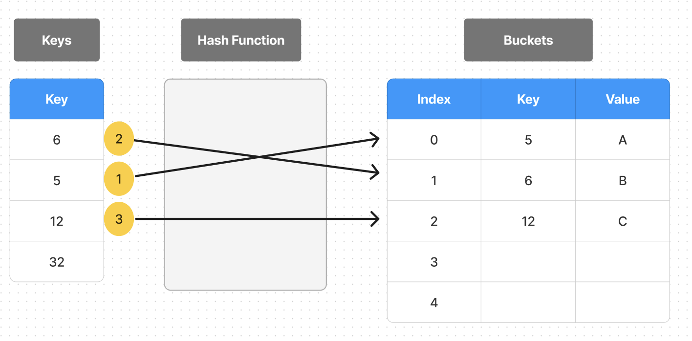 원본 데이터를 키(Key), 매핑 하는 과정을 해싱(Hashing), 결괏값은 해시 값이라고 한다.