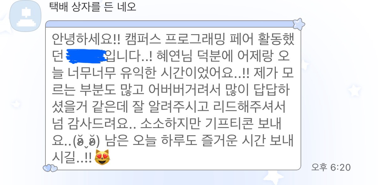 그렇게 2박 3일간 울산에 다녀왔다. 과제를 진행하고, 페어와 이야기 나누며 개발에 집중하는 동안 오랜만에 개발을 즐기고 있는 나 자신을 보았다. 이때부터 다시 개발이 조금씩 재미있어졌고, 앞으로 공부를 어떻게 이어가야 할지 방향이 잡히기 시작했다. 강의가 끝난 후에는 페어가 감사하다는 인사와 함께 선물을 보내주셨다. 나는 그저 내가 알고 있는 내용을 전달했을 뿐인데, 기분이 괜히 좋았고 묘한 감정이 남았다.