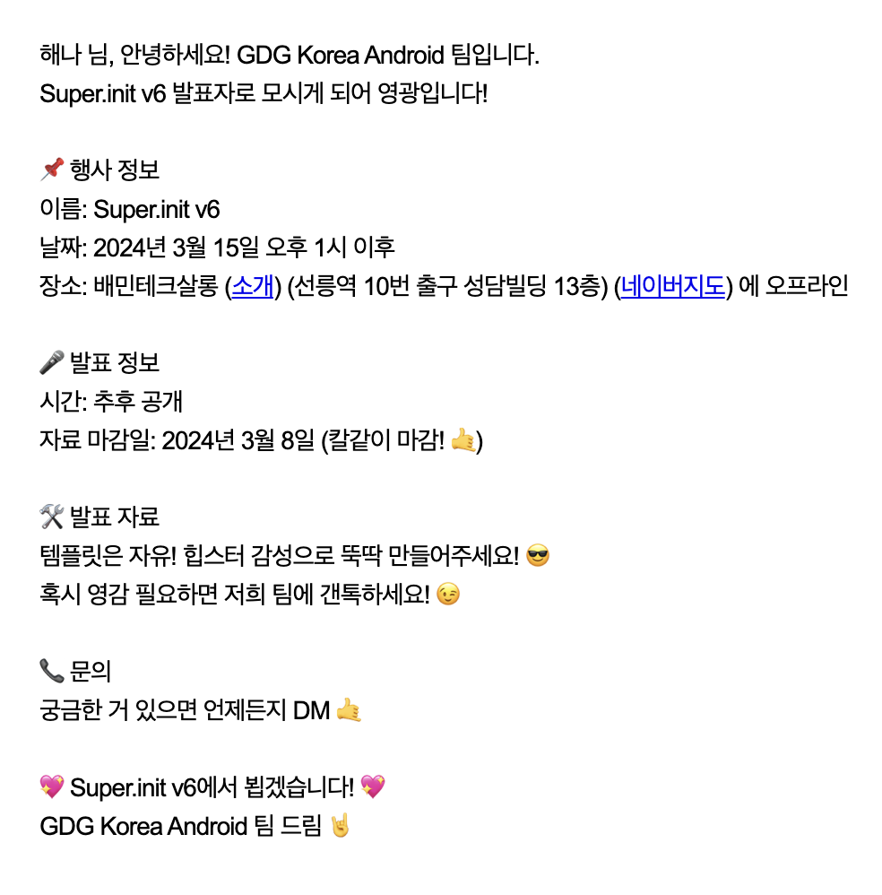 무기력한 나날들을 보내는 중에 Google Developer Groups Korea Android에서 주최하는 Super.init(version=6) 발표자 모집 글을 보게 되었다. 그 순간에는 단순히 2025년에 이루고 싶은 일 중에 컨퍼런스 발표가 있었기에 "발표를 해보고 싶다"는 생각만 스쳐 지나갔다.