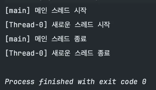 아래 이미지는 코드의 실행 결과이다. 코드의 실행 결과를 보면 메인 스레드에서 출력한 로그와 새로운 스레드에서 출력한 로그가 섞여 있는 것을 확인할 수 있다.
