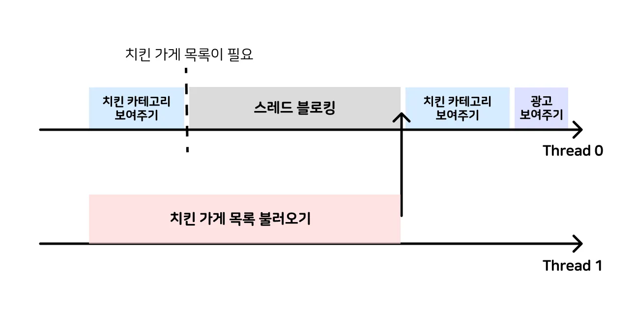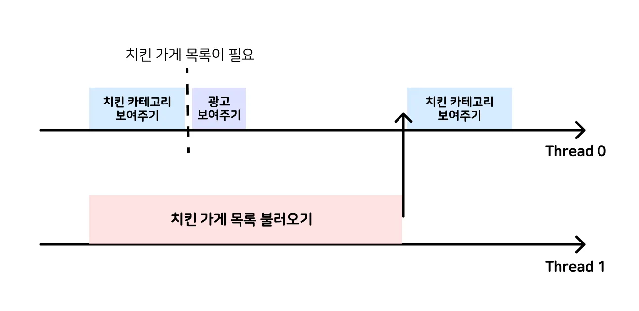 그림을 통해 이해해보자. 기존의 멀티 스레드 프로그래밍을 통해 Thread0에서 광고를 보여주기 위해서는 치킨 가게 목록을 불러온 후 수행해야 한다. 치킨 가게 목록을 보여줄 때까지 Thread0은 ‘치킨 카테고리 보여주기’ 작업이 점유하고 있기 때문이다.