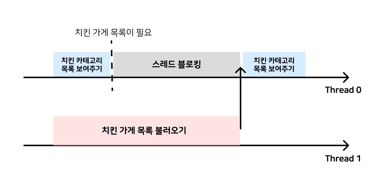 0번 스레드가 ‘치킨’ 카테고리를 이동해 치킨 가게 목록을 표시하려 할 때, 1번 스레드에서 해당 목록을 불러오고 있다면 결과값을 받을 때까지 대기해야 한다.