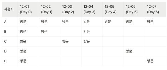 - Range를 3으로 정한다면, 3일씩 묶어서 1/2 ~ 1/4 중 한번이라도 방문했다면 방문한 유저에 포함하는 것이다.