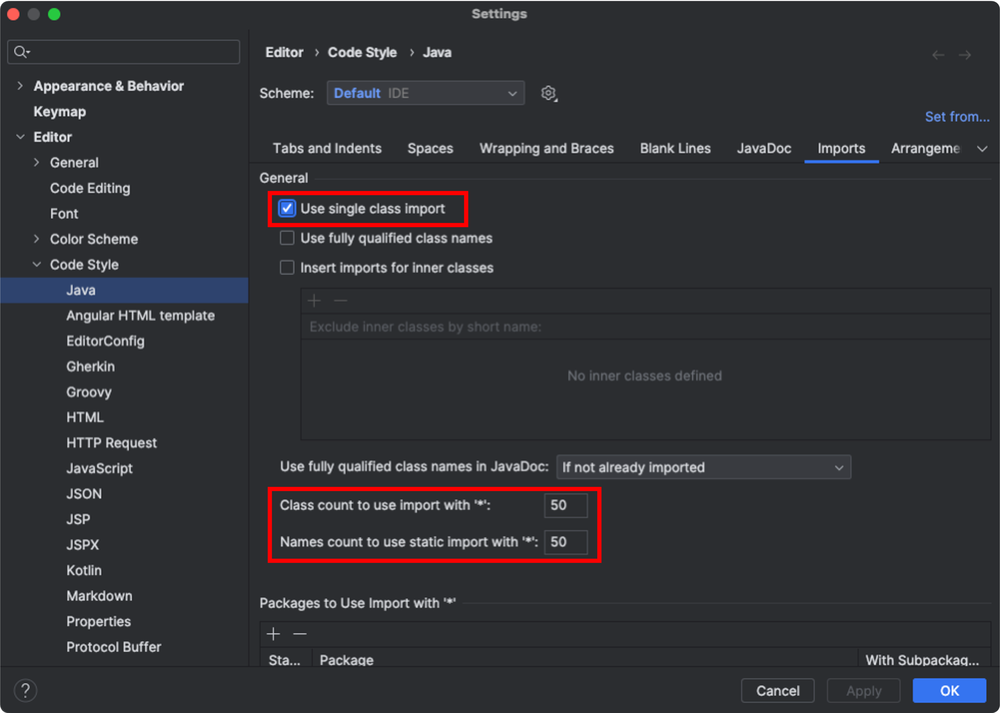 - Class count to use import with '*': 한 패키지에서 가져오는 클래스의 수가 설정된 숫자 이상일 때, import 구문에서 * 와일드카드를 사용한다.