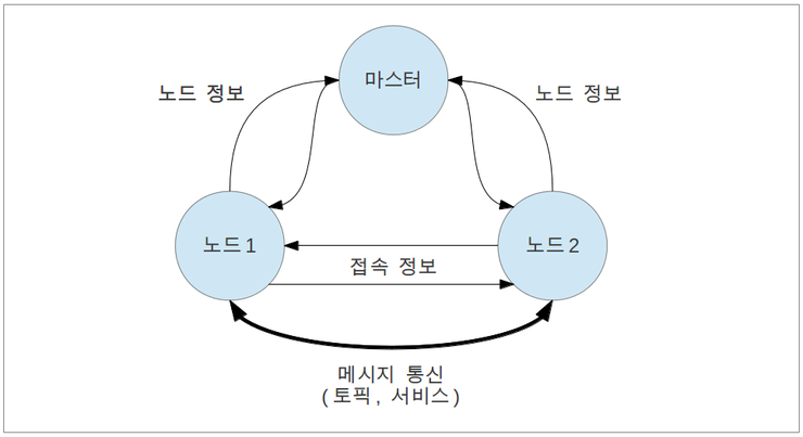 노드들 사이에서의 통신을 위해서는 노드 간의 접속이 필요한데, 이런 접속을 돕기 위해 사용하는 것이 바로 ROS 마스터(Master)이다. 마스터는 노드의 이름, 토픽 및 서비스의 이름, URI 주소와 포트, 파라미터 등을 모두 포괄하는 네임 서버 역할을 한다. 좀 더 자세하게 다루면, 노드는 생성과 동시에 마스터에 자신의 정보를 등록하며, 다른 노드가 마스터를 통해 접속하려는 노드의 정보를 얻게 된다. 그 이후 노드들끼리 직접적으로 연결되어 메시지 통신을 수행한다.