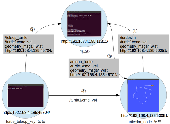 다음 그림은 마스터와 turtlesim 노드, turtle_teleop_key 노드 간의 통신을 도식화 한 이미지이다.