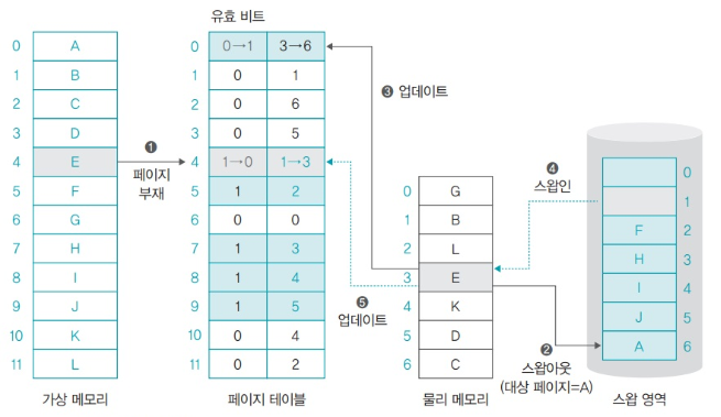 - 4번에서 대상포인터가 가리키는 페이지 A가 스왑영역으로 이동