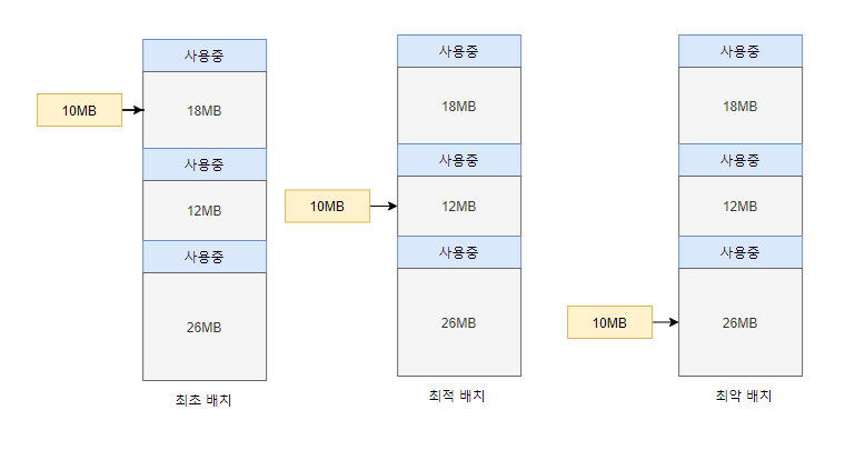- 위의 경우 10MB 크기 프로세스는 처음 빈 공간 18MB에 배치됨