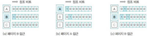 - 페이지 B에 접근하면 페이지 B의 참조 비트 맨 앞이 1됨