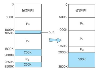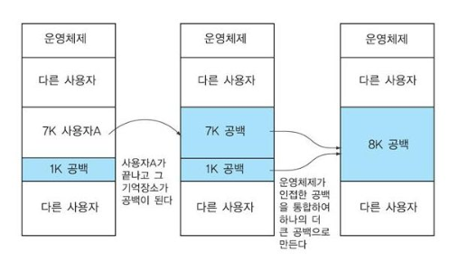 - 프로세스가 종료되면 주변의 빈 조각을 합쳐서 하나의 큰 덩어리를 만듦