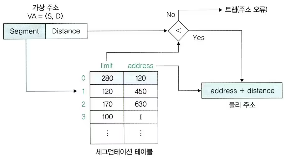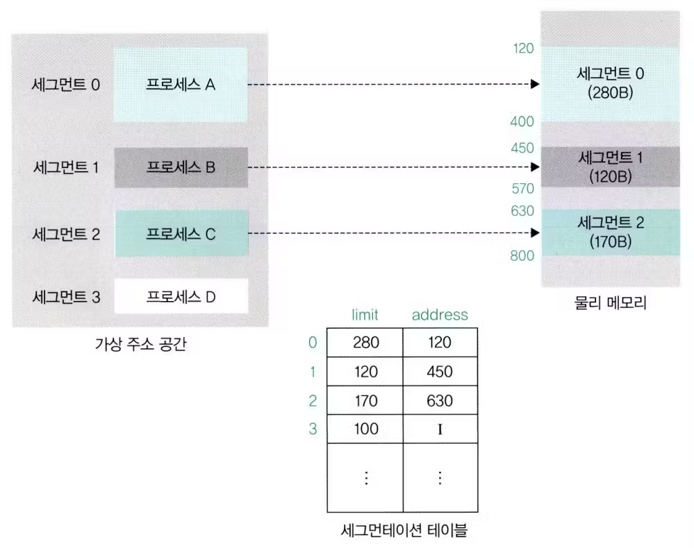 - 가변 분할 방식(=세그먼테이션 메모리 관리 기법)