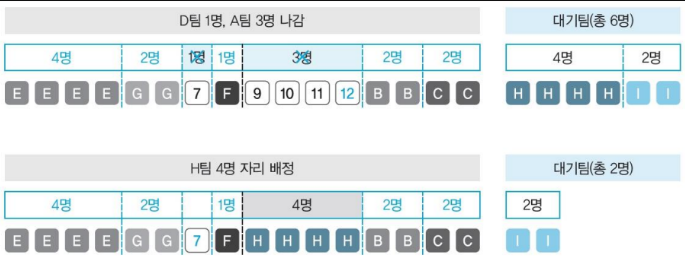 - 기존 A팀 3명, D팀 1명이 나갈 경우 9~12번에 H팀 앉음