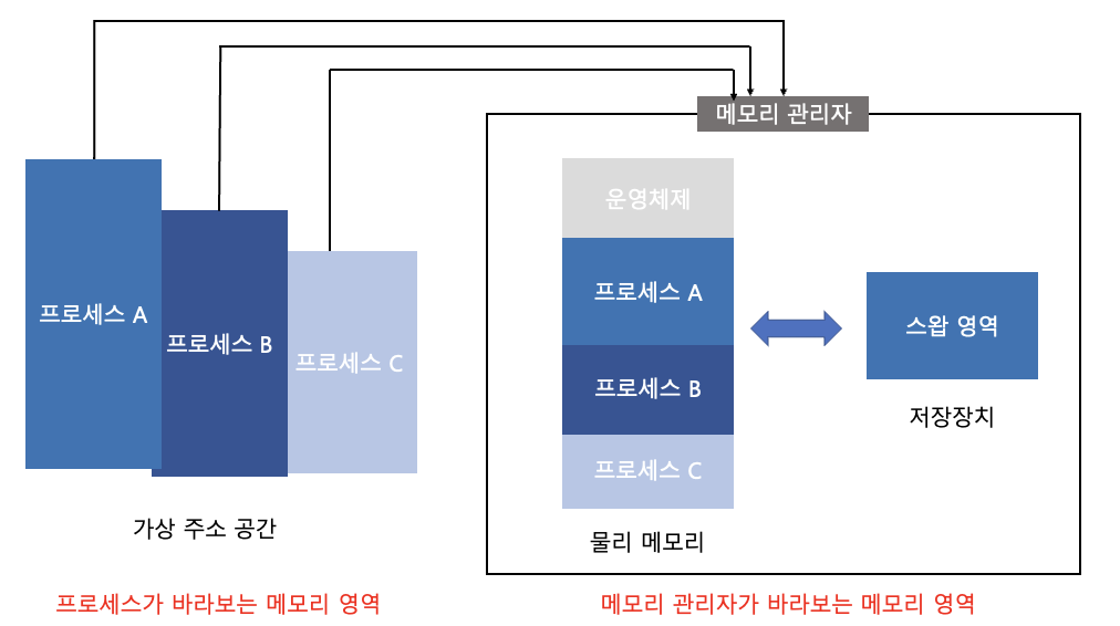 - 만약 물리 메모리가 부족하면 둘 중 하나는 스왑 영역에 있을 수도 있음