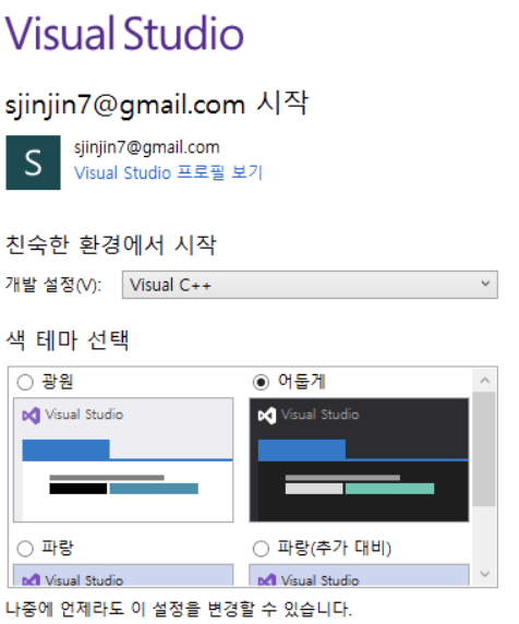 로그인 또는 나중에 로그인하기 이후 '개발 설정', '색 테마 선택'을 선택 해주신 후 [Visual Studio 시작]을 클릭합니다.