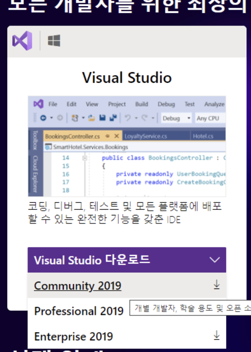 [VisualStudio 다운로드]에 마우스를 이동한 후 [Community 2019]를 클릭하여 설치 파일을 다운로드합니다.
