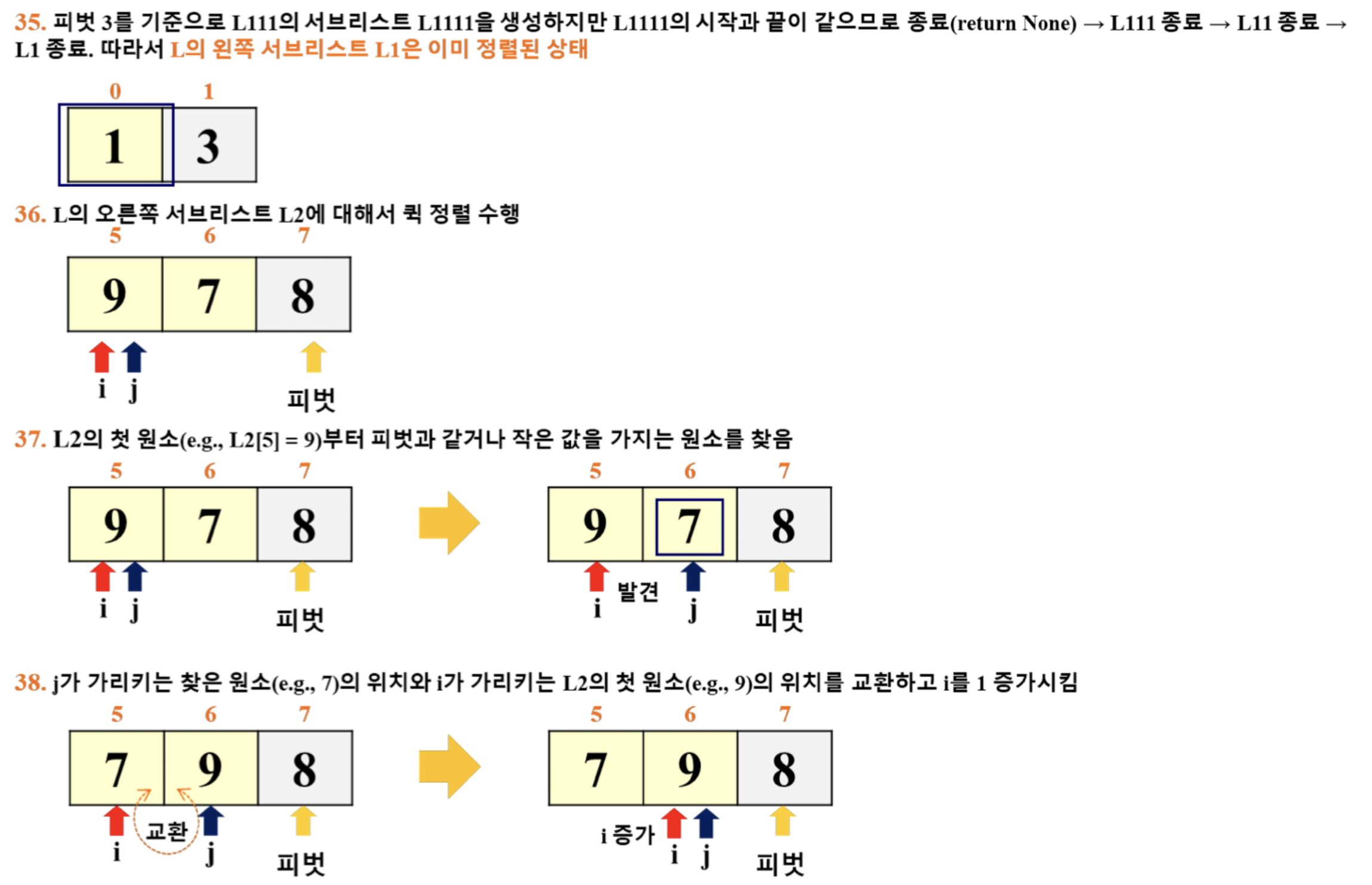 (3) 각 서브리스트를 재귀적은 방식으로 퀵 정렬을 수행하여 정렬한 다음