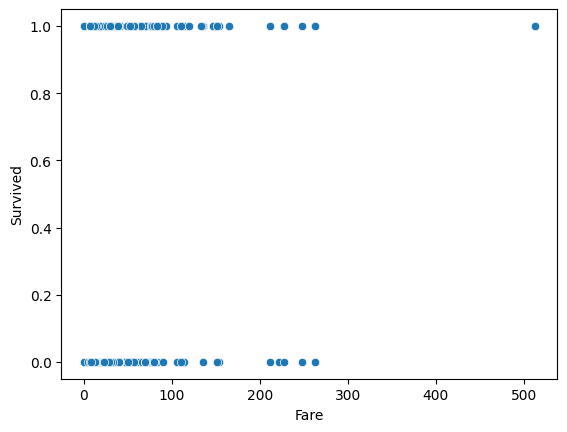 sns.scatterplot(titaninc_df, x = 'Fare',y = 'Survived')