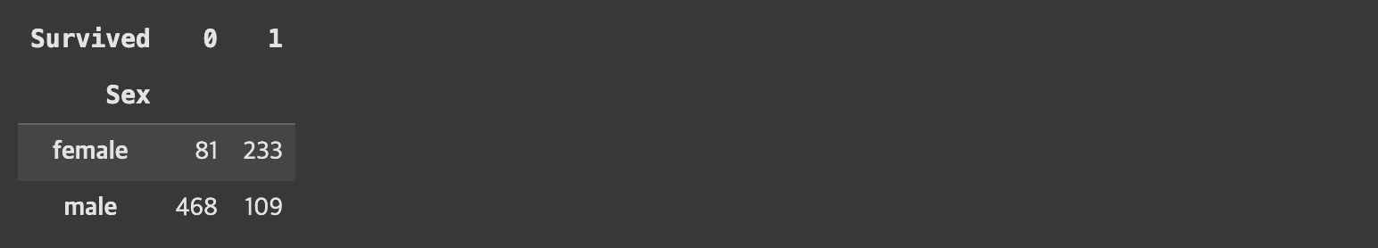 pd.pivot_table(titaninc_df, index = 'Sex', columns = 'Survived',aggfunc='size')