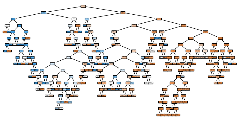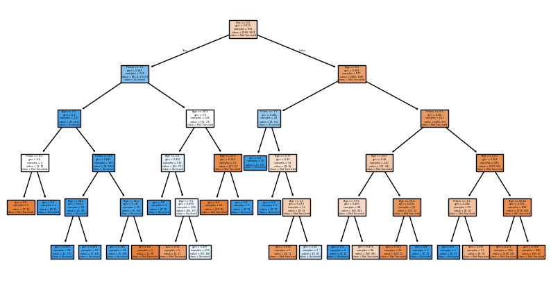 plot_tree(model_dt, feature_names=X_features, class_names=['Not Survived','Survived'], filled= True)