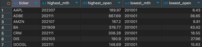 (highest_open,highest_mth)- 각 종목의 최저 개시 가격 (lowest open)과 해당 가격이 찍힌 해당 월