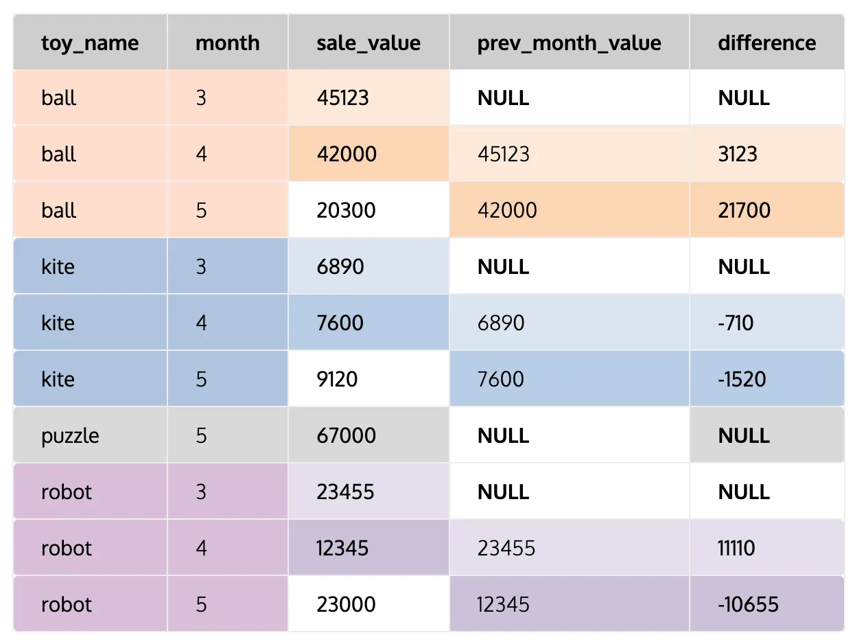 LAG(sale_value) OVER(PARTITION BY toy_name ORDER BY month)