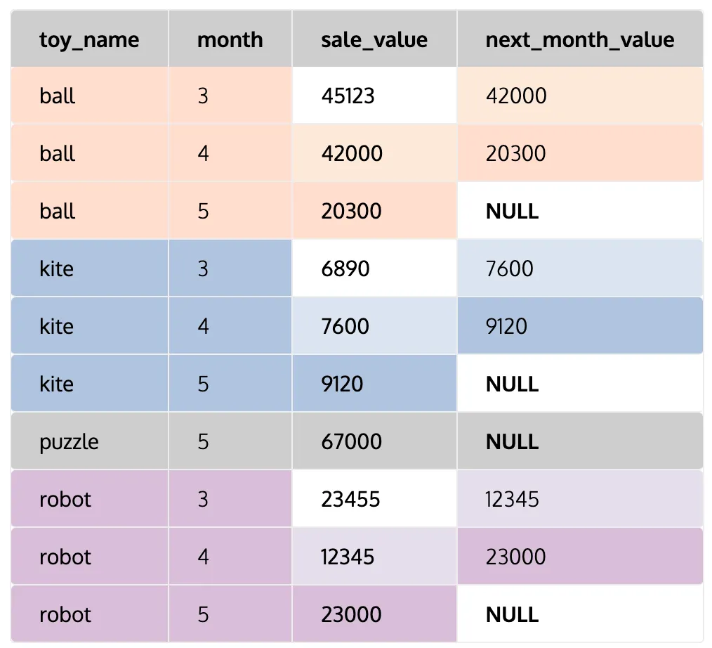 LEAD(sale_value) OVER(PARTITION BY toy_name ORDER BY month)