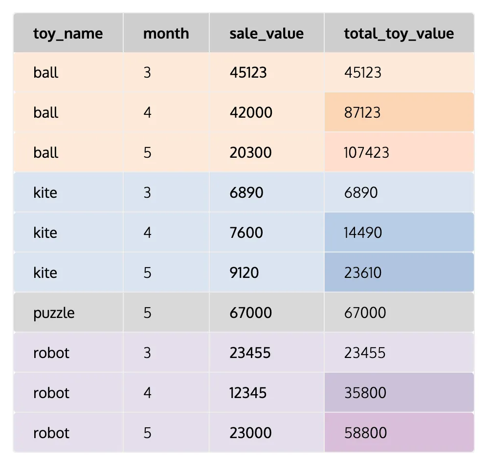 SUM(sale_value) OVER(PARTITION BY toy_name ORDER BY month)