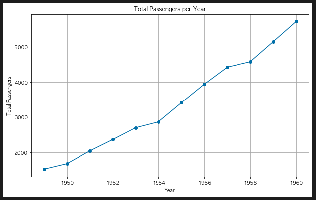 1. 연도 별 총 승객 수 with line graph
