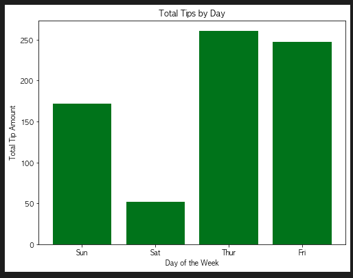 2. 요일별 총 팁 금액 with bar chart