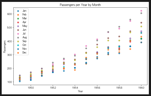 4. 연도 별 승객 수와 월간 승객 수 with scatter plot