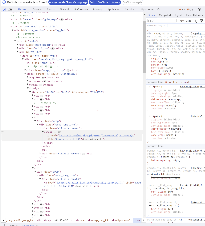 - 태그들을 타고 들어가면, 노래 제목은 'rank01'의 'span' 태그의 'a' 태그에 있고, 가수는 'rank02' 태그의 'a' 태그에 있고, 앨범 정보는 'rank03' 태그의 'a'태그에 있고, 앨범 커버 이미지의 정보는 'img'의 'src'인자에 있음을 알 수 있음.